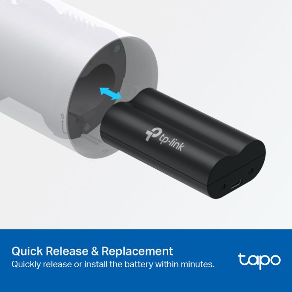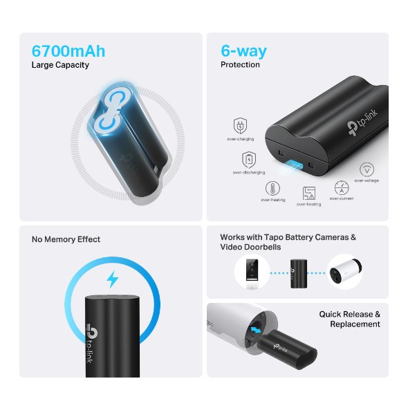 Baterie s velkou kapacitou 6 700 mAh, pro kamery a videozvonky Tapo, rychlé a bezpečné nabíjení, doba pro plné nabití cca 5 hodin, ochrana proti zkratu, přebíjení, přehřátí, přepětí, nadměrnému vybíjení a nadproudu.