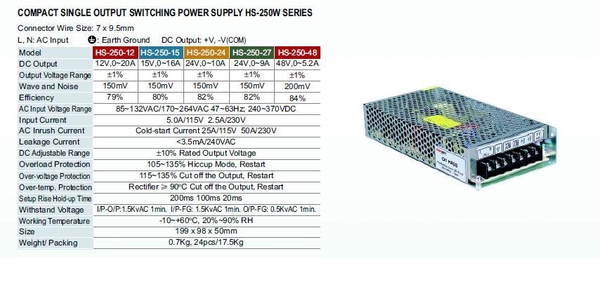 Průmyslový zdroj 48V=/250W spínaný HS-250/48, CARSPA Parametry a specifikace: DC výstup 48V 5.2A Vlnění a hluk 150mVP-p Vstupní stabilita +-1% Zátěžová stabilita +-1% Efektivita 82% Nastavitelný rozsah napětí DC +-10% AC rozsah