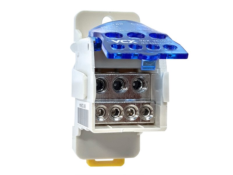 Distribuční blok VCX UKK 80A / 6 otvorů / 80A / 690V / na DIN lištu Distribuční nebo také rozvodný blok s mosaznými šrouby pro správné a přehledné připojení kabelů v nízkonapěťových rozvodnách. Modulární rozvodné bloky VCX jsou určeny k rozvodu prou