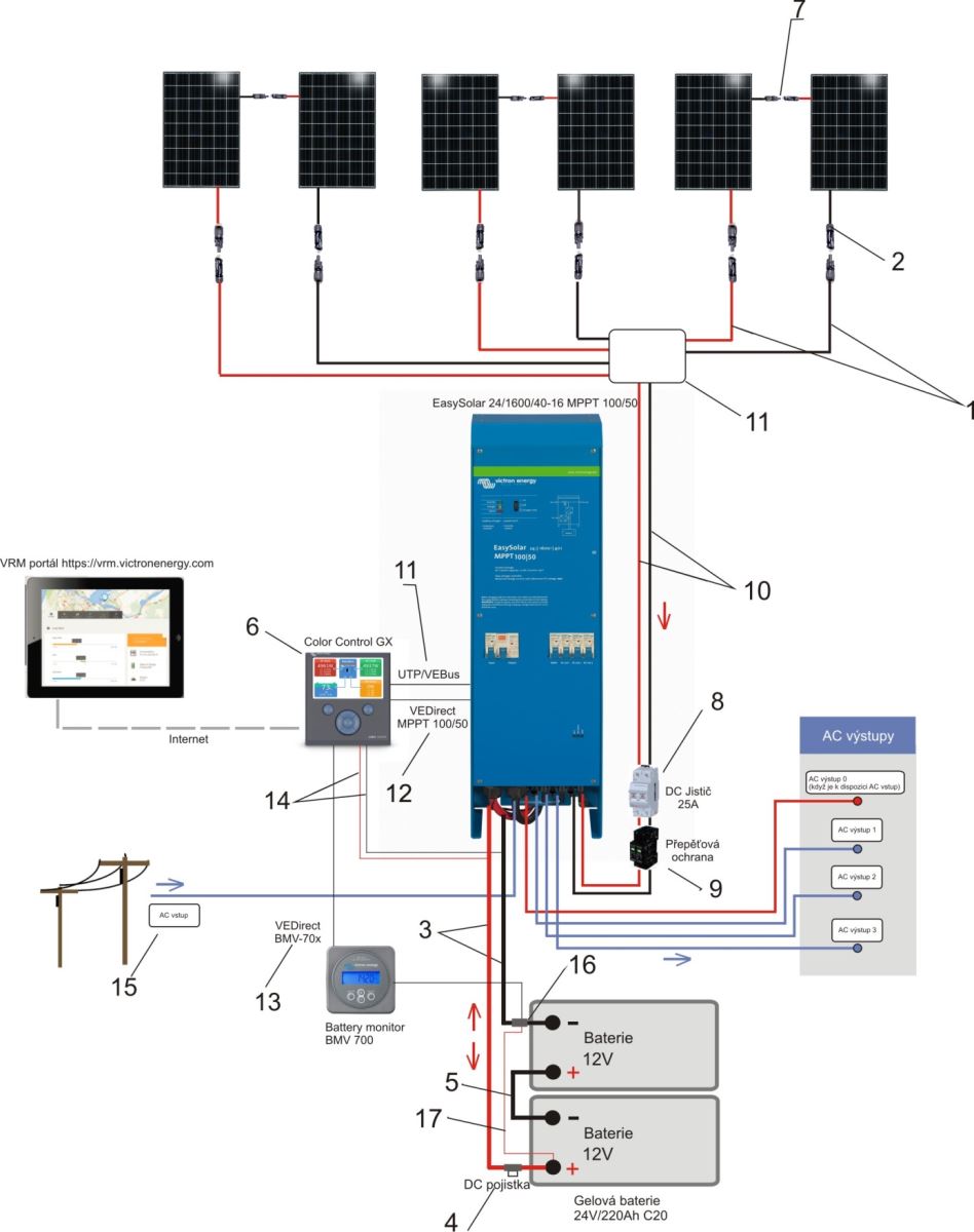 - dle nastavení umožňuje pracovat bez dodávek/s dodávkou solárních přebytků do rozvodné sítě