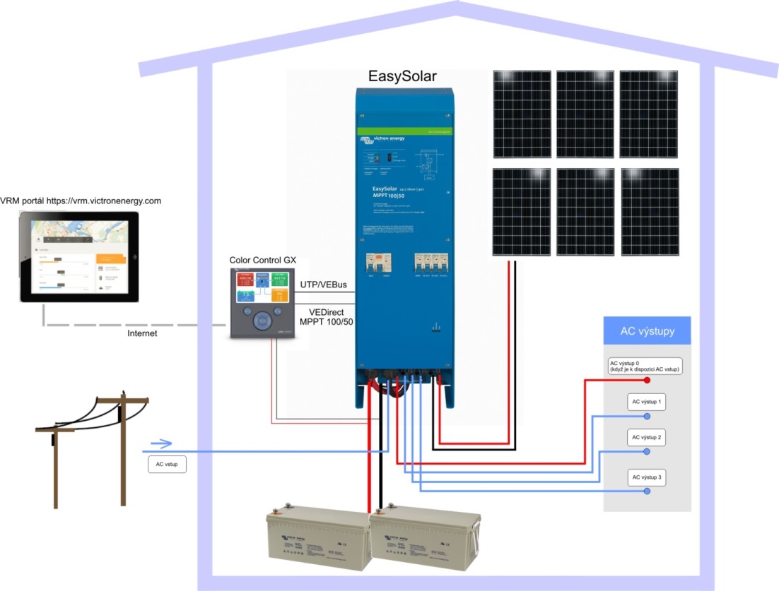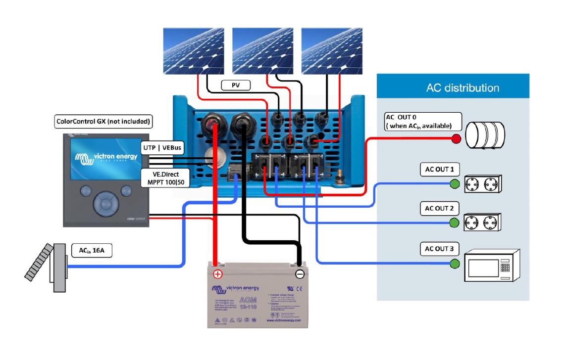 Jde o kompaktní zařízení dva v jednom spojující zařízení měnič/nabíječku (MultiPlus) a solární MPPT regulátor. Měnič/nabíječka odebírá vyrobenou energii přímo ze solárního systému a/nebo energii uloženou v baterii, přeměňuje ji na střídavý proud a napájí připojené 230 V AC spotřebiče. V nejnutnějších případech (viz dále) využívá i energii z distribuční sítě (nebo jiného zdroje, třeba generátoru). Solární MPPT regulátor maximalizuje množství vyrobené energie z fotovoltaických panelů, předává energii měniči/nabíječce pro napájení spotřebičů a přebytky energie ukládá do baterie pro její budoucí využití v době nedostatku solární energie (například v noci).