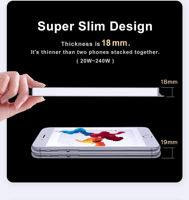 Tenký design s plně utěsněným hliníkovým krytem. Super štíhlá výška 18 mm pro venkovní reklamu, značení, světelný box, LED modul a pásky atd.
