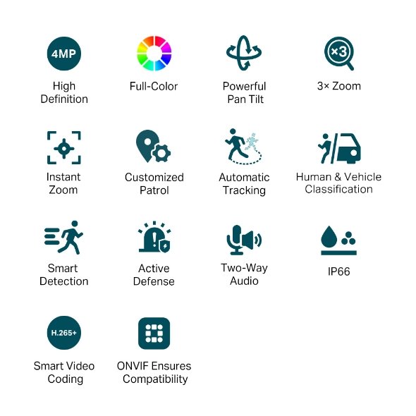 Kamera, rozlišení 4 MPx, 3x zoom, tichý provoz, čistý obraz i ve večerních hodinách, plnobarevné noční vidění. Rozlišení lidí a vozidel. Hlasový interkom a siréna. Snadná správa díky aplikaci VIGI.