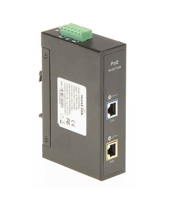 MaxLink MAXPIDIN30 je aktivní PoE injektor s montáží na DIN lištu se vstupním DC napájením 12 až 48V a vestavěným měničem napětí. Výstupem tohoto zdroje je Gigabitový port s podporou 802.3af/at PoE (55V) určeným pro WiFi, VoIP či bezdrátová pojítka. PoE