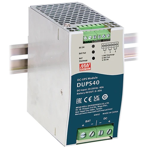 DUPS40 je 40A modul DC-UPS na lištu DIN, který je spojen s napájecím zdrojem a externí baterií pro dosažení funkce zálohování. Nová generace zdrojů nahrazující předcházející modelovou verzi DR-UPS40; Při výpadku nebo přerušení střídavé sítě se zátěž