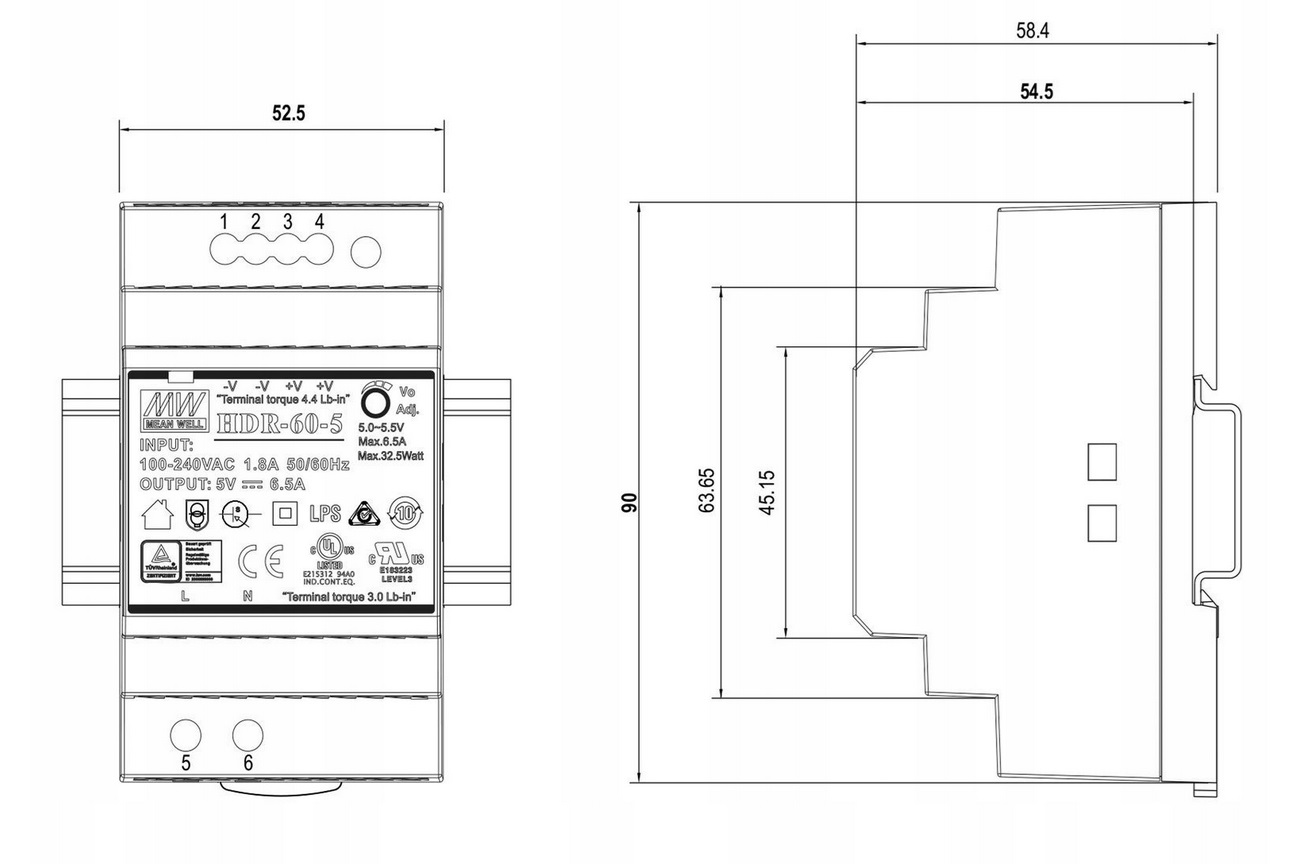 • MEAN WELL HDR-60-24 průmyslový napájecí spínaný zdroj 24V 60W na DIN