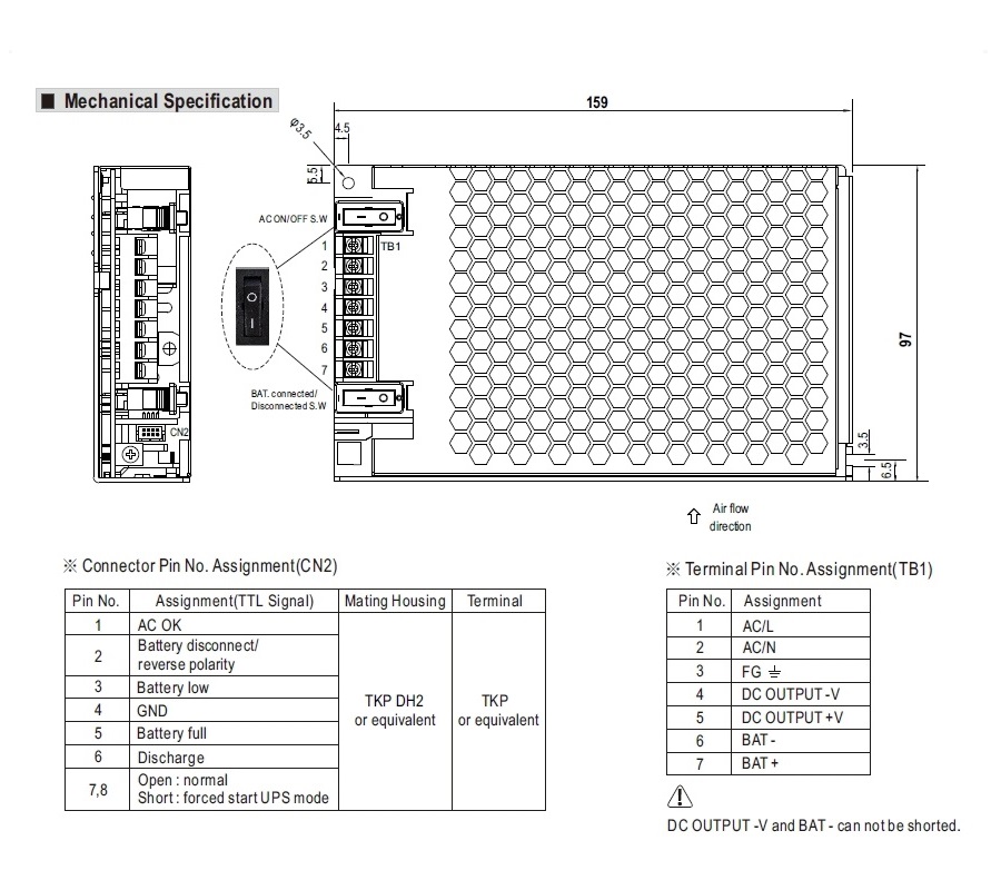 • TTL signály pro detekci stavu: AC OK, odpojení baterie, přepólování baterie, vybití baterie, plná baterie a vybití baterie.