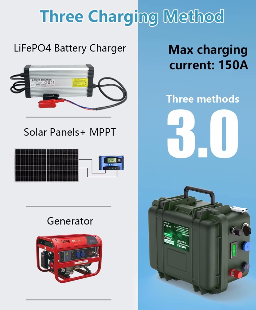 Nabíjecí baterie LiFePO4 12V 150Ah - lithium-železo fosfátová baterie má větší výkon, menší hmotnost a vydrží mnohem déle než olověná baterie. Extrémně bezpečná s velmi nízkou toxicitou pro životní prostředí. Baterie je umístěna v pouzdře z voděodolného materiálu ABS. Speciálně navržený inteligentní systém BMS inteligentně řídí a monitoruje provozní podmínky baterie, čímž zajišťuje, že baterie funguje v bezpečném prostředí, zajišťuje dlouhou životnost a efektivní provoz. Je možné zapojit několik baterií do série nebo paralelně (až 4 kusy), což je vhodné pro vysoce energeticky náročné aplikace.