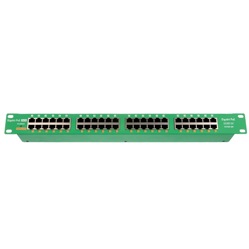 Panel integrující 24 gigabitových stíněných aktivních POE injektorů s napájecím rozsahem 48V (802.3af) - 57V (802.3at).