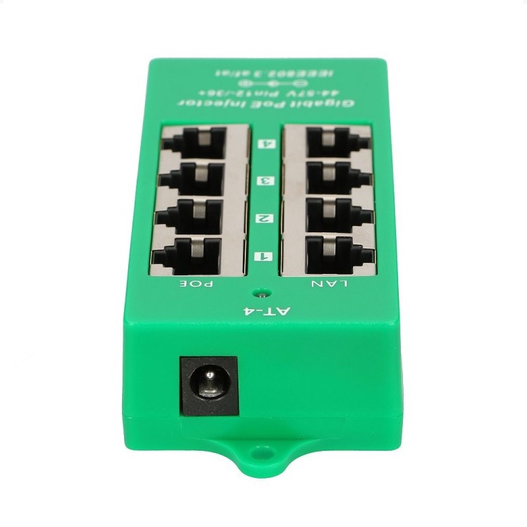 Panel integrující čtyři gigabitové POE injektory s napájecím rozsahem 44-57V a max. proudem 550mA/port s podporou standardu 802.3af/at.