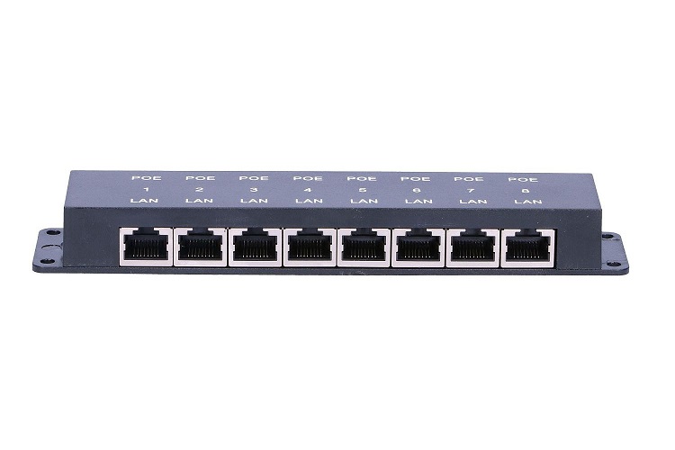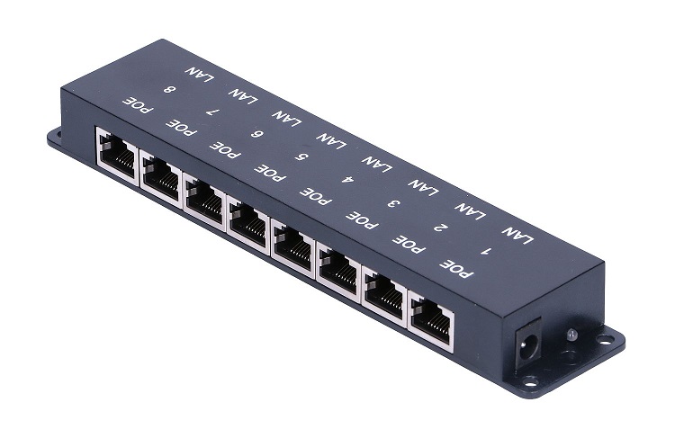 Panel integrující 8 pasivních POE injektorů vhodný pro napájení až osmi zařízení. Do RJ45 konektorů na jedné straně se připojují ethernetové porty bez napájení (např. switch), na opačnou stranu se připojují zařízení, využívají napájení po ethernetovém