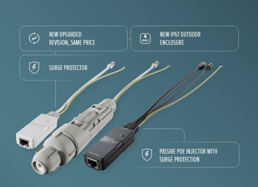 • MikroTik GESP+POE-IN - pasivní gigabitový PoE injektor s přepěťovou ochranou, vnitřní