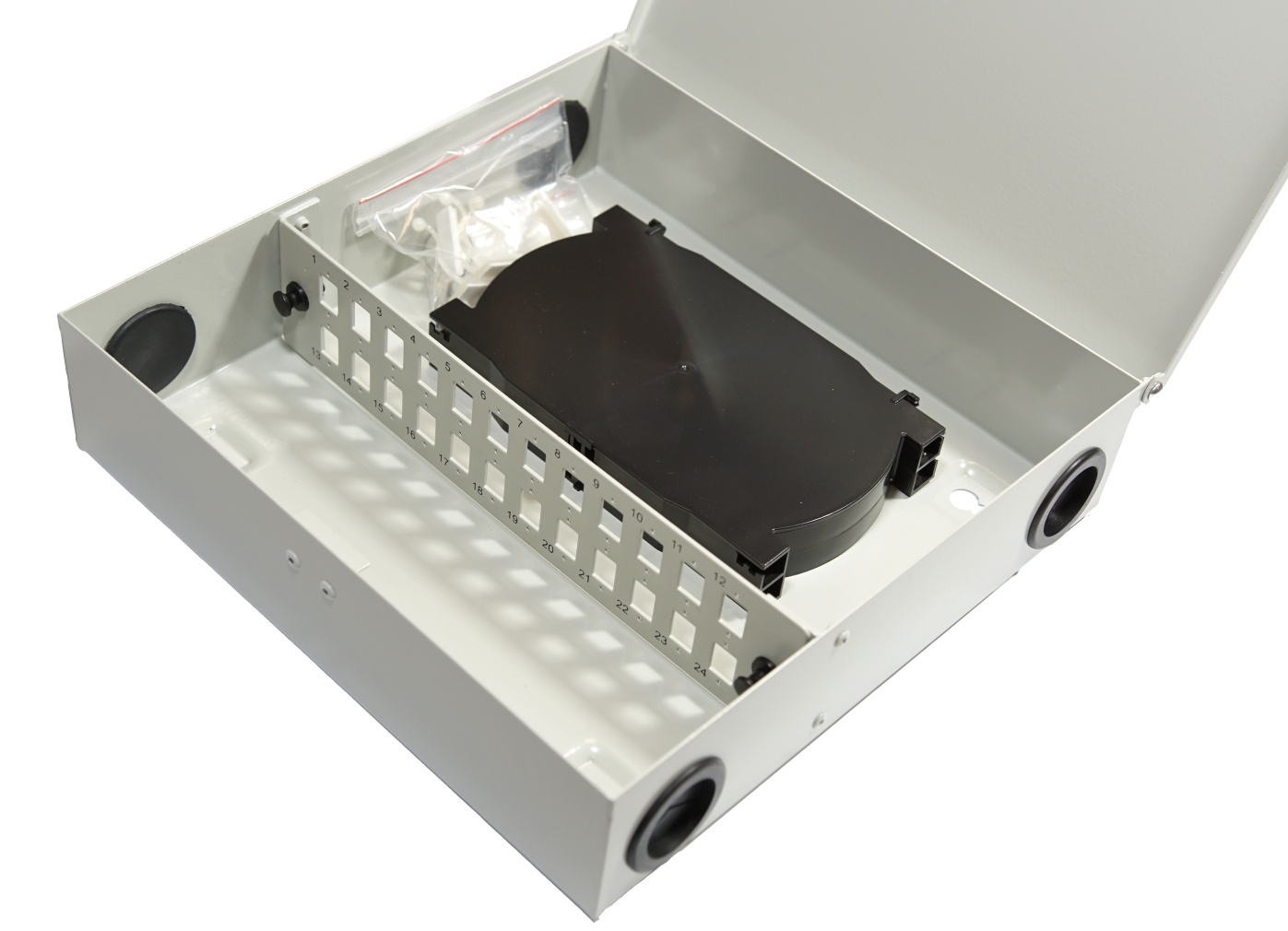 Rozvaděč kovový optický jednokřídlý se zámkem vybavený čelem pro 24x SC (24x LC Duplex, 24x E2000)