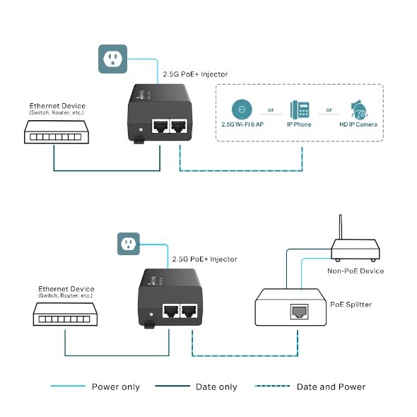 PoE adaptér/injektor, 2 rychlé porty 2,5 Gb/s, standard IEEE 802.3af/at, Plug and Play, integrovaný zdroj napájení, automatické dodávání potřebného výkonu připojenému zařízení.