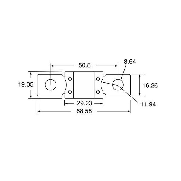Pojistka MEGA, 300A, M8. Jmenovité napětí 32 V DC. Technické parametry: Rozteč otvorů: 51 mm Průměr otvorů: M8 Rozměr pojistky: 68 x 16 mm