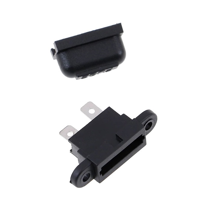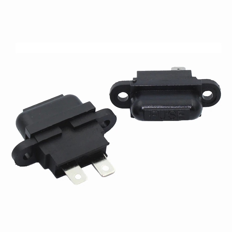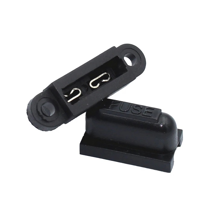 Pojistkové pouzdro pro autopojistku 19x12mm na panel. Standardní držák pojistek. Parametry produktu: Fastony: 4,8mm Montážní otvor: 21×7mm Rozteč montážních děr: 25mm Obsah balení: pouze pouzdro, bez pojistky Materiál: Plast, kov Počet pinů: 2