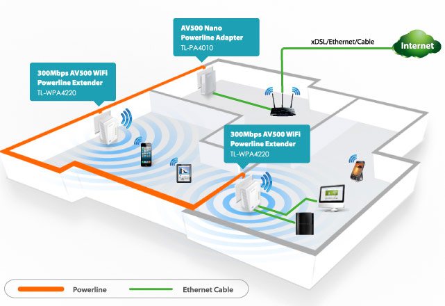 TL-WPA4220 + TL-PA4010 rozšíří vaše internetové připojení do každé místnosti domu pomocí stávající elektrické sítě. Poskytuje vysokorychlostní přenos dat rychlostí až 500 Mbit / s na vzdálenost až 300 metrů a rychlost bezdrátového připojení až 300 Mbit/s