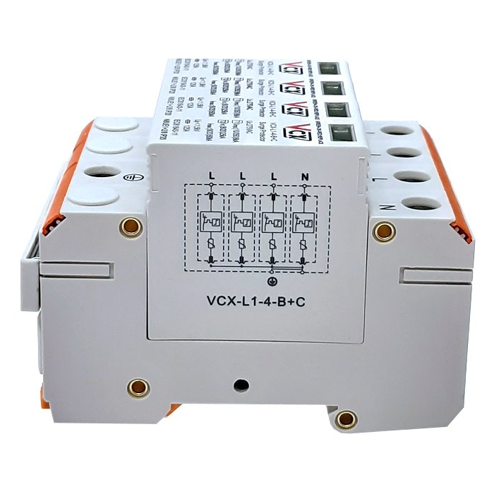 Modulární přepěťová ochrana VCX-L1-4-B+C 8 kA třídy T1 T2 je určená k ochraně napájecích instalací NN proti indukovaným a spínacím přepětím.