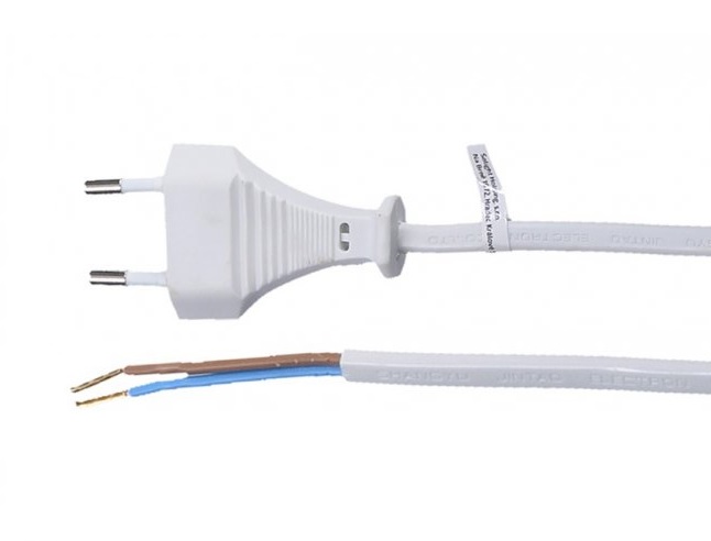 Bílá flexo šňůra je napájecí přívod a slouží například jako náhradní způsob napájení při poškození vidlice nebo přívodního kabelu. Má plochu průřezu vodiče 2 x 0,5 mm2 a délku kabelu 5 m.