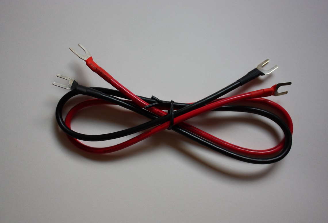 Propojovací kabely - 1x černý, 1x červený, zakončený vidličkou na obou stranách je ideální k propojování baterií, měničů napětí, atd...se závitem M6. Propojením více baterií můžete zvýšit výstupní napětí (sériové zapojení) nebo celkovou kapacitu (paralel