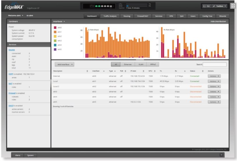EdgeRouter je vybaven celkem 3x Gbit ethernetovými porty, 1x SFP, dostatečně velkou operační pamětí 1GB typu DDR3, úložným prostorem o velikosti 4GB a 1x USB 3.0. Celý provoz řídí čtyřjádrový procesor.