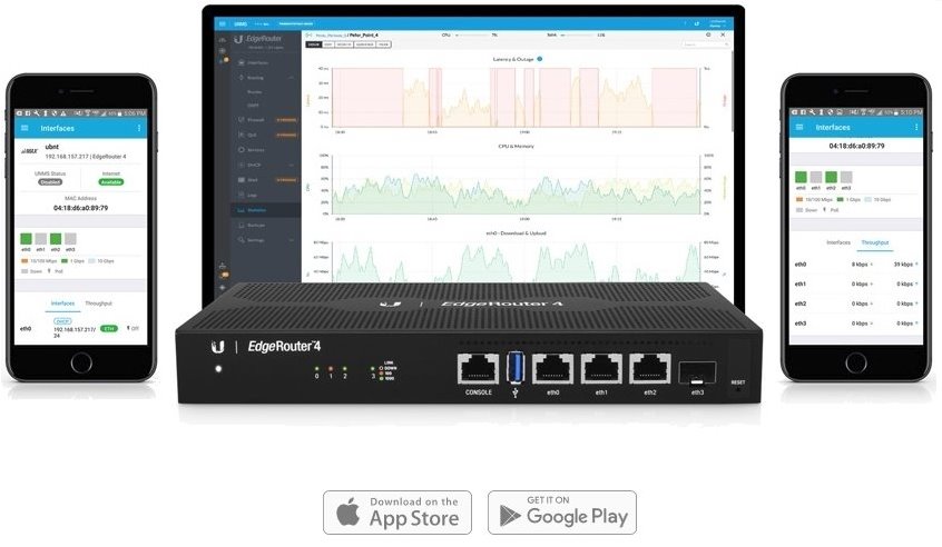 EdgeRouter 4 je vhodný všude tam, kde je nutné směrovat velké množství dat, do malých i středních firem a všude kde je kladen důraz na bezpečnost sítě. EdgeRouter je vybaven celkem 3x Gbit ethernetovými porty, 1x SFP, dostatečně velkou operační pamětí 1GB typu DDR3, úložným prostorem o velikosti 4GB a 1x USB 3.0. Celý provoz pak řídí čtyř-jádrový procesor taktovaný až na 1 GHz, MIPS64 s hardwarovou akcelerací pro zpracování paketů. EdgeRouter nabízí všechny základní funkce, které u routeru očekáváte.