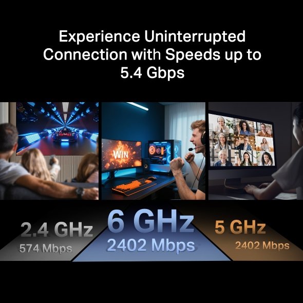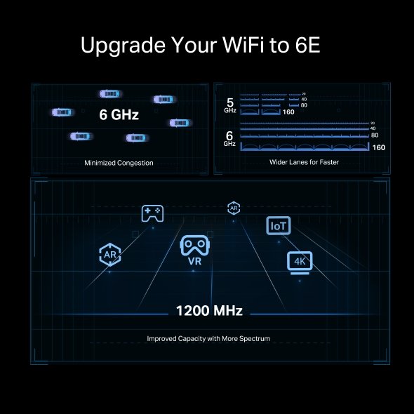 Adaptér Archer TXE73E rozšiřuje možnosti WiFi připojení díky podpoře pásma 6 GHz, které nabízí vyšší šířku pásma, rychlost a nižší latenci. V kombinaci s technologií OFDMA a MU-MIMO umožňuje připojení více zařízení současně bez snížení výkonu.