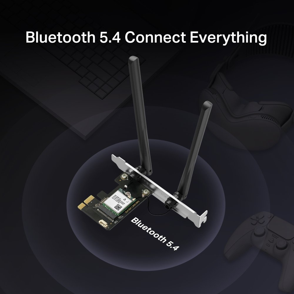 Síťová karta, dvoupásmová síť, 1 201 Mb/s v pásmu 5 GHz a 574 Mb/s v pásmu 2,4 GHz, WiFi 6, OFDMA, Bluetooth 5.4.