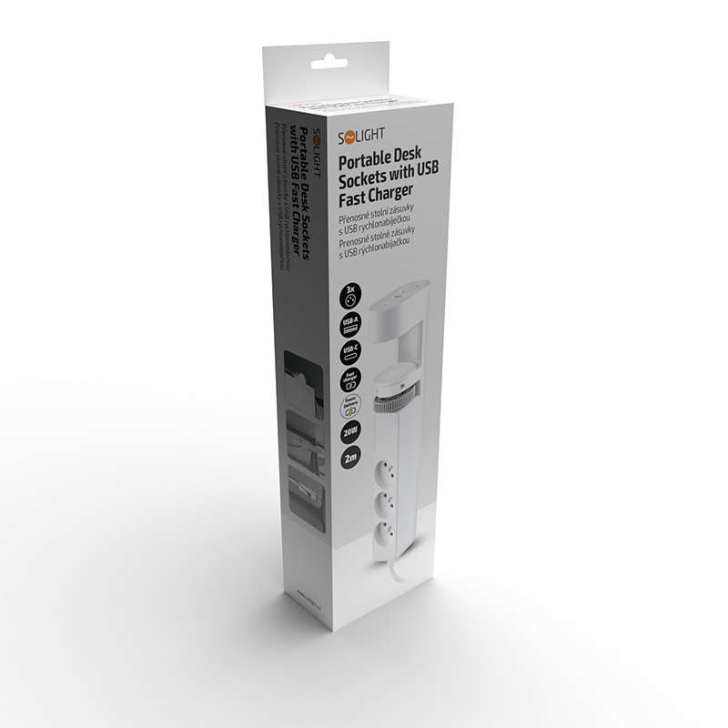 Solight 3z + USB A+C přenosné stolní zásuvky, 2m, bílá, USB rychlonabíječka 20W PD Parametry produktu: - upevnění na stůl či pracovní desku bez nutnosti vrtání - zásuvky 230V schované pod stolem, USB nabíječka a centrální vypínač přístupné shora - s