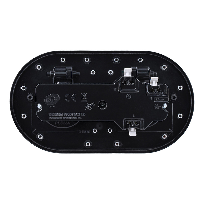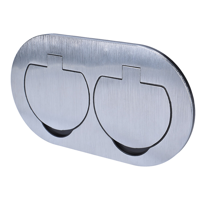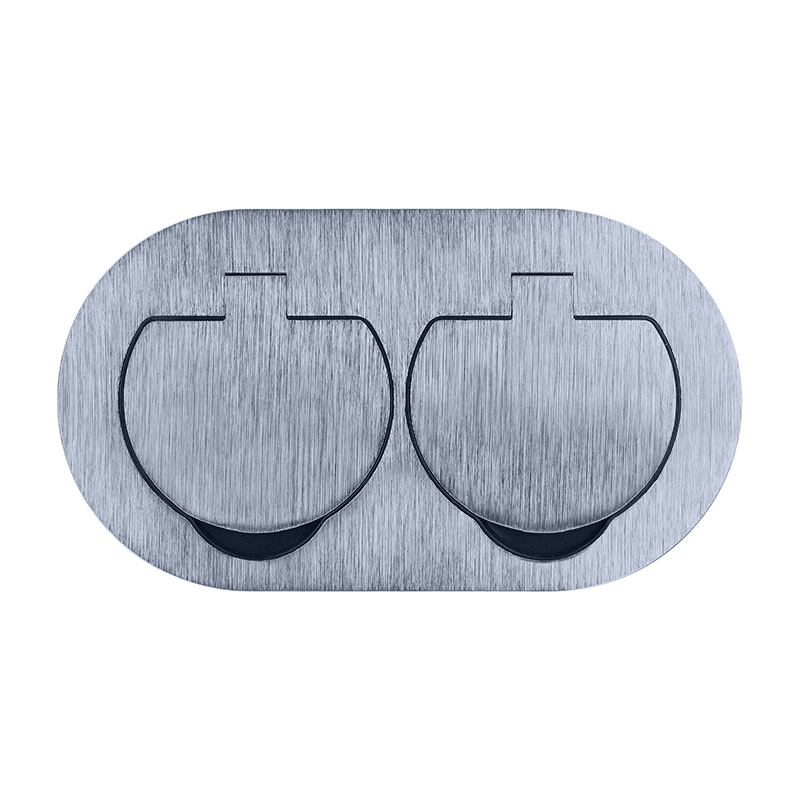 Vrchní kryt zásuvky je vyroben z odolné zinkové slitiny, která zajišťuje pevnost a zároveň ochranu proti korozi. Na povrchu nejsou viditelné žádné šrouby – montážní otvory zůstávají skryté pod každým víčkem. Díky tomu působí zásuvka elegantně a profesionálně a zároveň se snadno čistí.