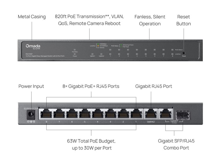 • Počet portů: 9× RJ45 (z toho 8× PoE+), 1× combo RJ45/SFP