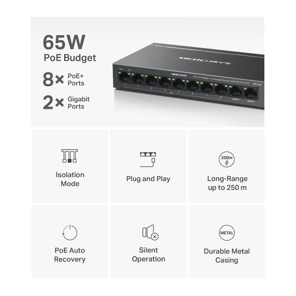Se switchem Mercusys MS110CP od TP-Link získáte stabilní připojení, které se hodí hlavně v menších firmách, ubytovnách nebo kancelářích. Poskytne vám osm 10/100Mbps portů PoE+ a 2 gigabitové porty bez PoE. K napájení a přenosu dat vám postačí jeden ethernetový kabel. Jistě vás potěší také tichý chod a nízká spotřeba energie díky bezventilátorovému provedení. Odolný kovový kryt dobře odvádí teplo.