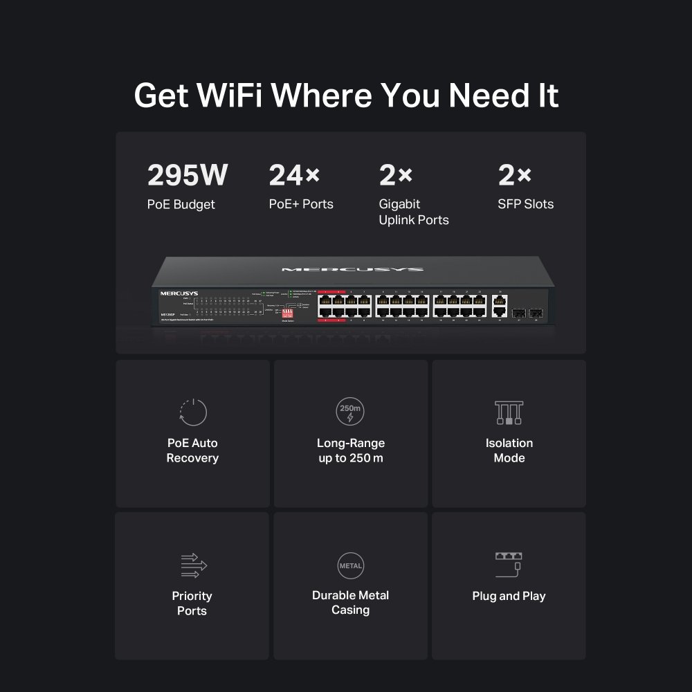Switch Mercusys MS128GP nabízí 24 PoE+ portů s napájením až 30 W na každý port a celkovým PoE rozpočtem 295 W. Ideální volba pro IP kamery, přístupové body nebo IP telefony v dohledových systémech a menších firmách.