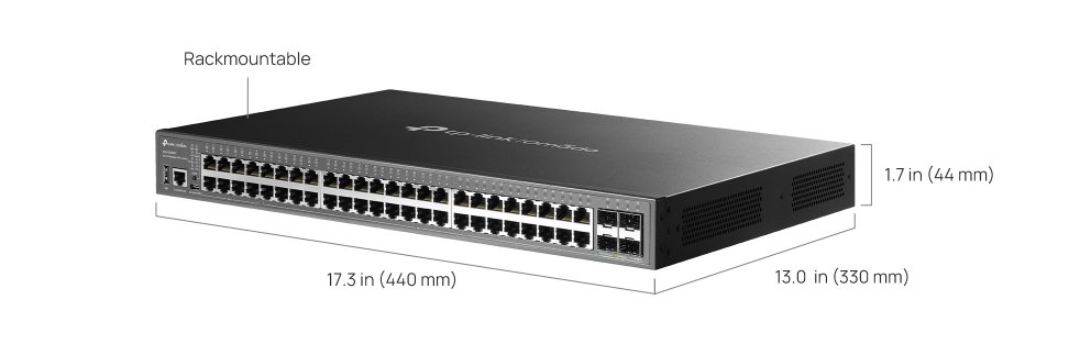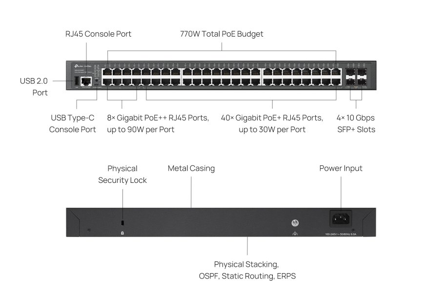 48× GLAN (8× PoE++, 40× PoE+), 4× SFP+ 10G, PoE 770 W, L3 směrování, stohování, Omada SDN, Perpetual PoE.