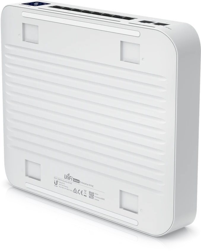 UniFi Switch Enterprise 8 PoE je spolehlivý managovatelný 2.5-Gigabitový L3 Switch (L3 podporováno v budoucích fw) s kapacitou přepínání 80 Gbps(8) 2.5-Gigabit LAN porty a dvěmi SFP+ (10Gbps) šachtami. Všechny ethernetové porty podporují 802.3af/at PoE-Out s výstupním výkonem 30W/port a celkovým PoE budgetem 120 W. Switch má kromě standardní výbavy také 1,3" dotykovým displej pro poskytování informací o systému, teplotě, statistice portů, PoE napájení a mnoho dalšího. Switch lze napájet přes 230V a jeho maximální spotřeba včetně PoE je 150W.