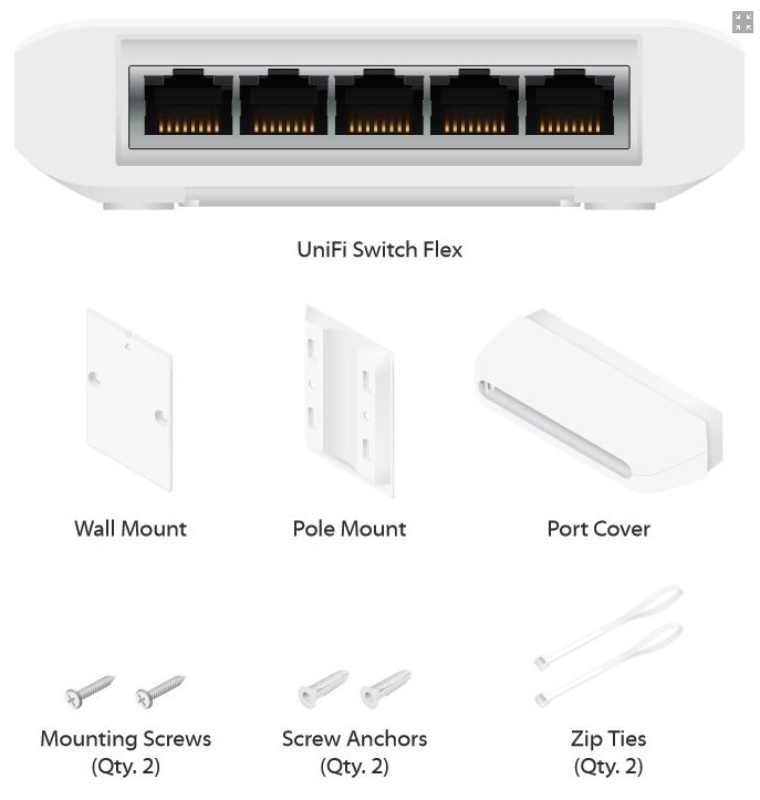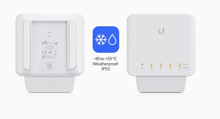 Switch USW-FLEX UniFi flex značky Ubiquiti Networks je 5portový venkovní Gigabitový switch umožňující PoE-In a PoE-Out na 4 portech. Výstupní porty zvládají aktivní napájení typu 802.3af, což dává celkově 15,4 W na každém portu.