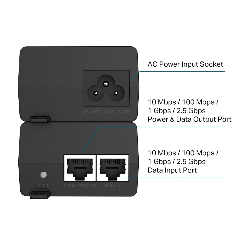 TL-POE260S je PoE injektor pro jedno napájené zařízení. Splňuje standardy 802.3af/at s maximálním výkonem 30W. Disponuje dvěma ethernetovými porty 10/100/1000/2500Mbps, z nichž jeden je určený pro napájení připojeného zařízení a druhý je určený pro připojení do sítě LAN.