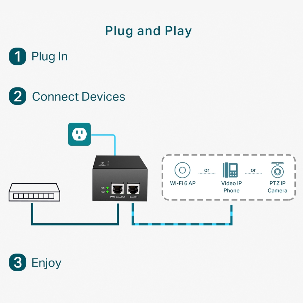 TL-POE170S je velmi robustní Gigabitový napájecí PoE injektor, který podporuje 802.3af/at/bt standardy s výkonem až 60 W, což je vhodné řešení pro napájení PTZ kamer, LED panelů, výkonější Wi-Fi AP a dalších zařízení. Injektor má LED indikaci, euro napájecí konektor na 230 V a dva RJ-45 porty z nichž první je určen na DATA a druhý na DATA + napájení.