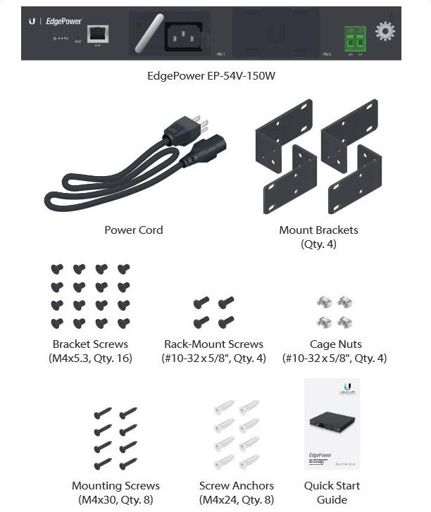 EP-54V-150W je v základu dodáván s jednou obsazenou šachtou se vstupem na 230V s maximálním výstupním výkonem 150W, úchyty do racku a potřebnými šroubky.