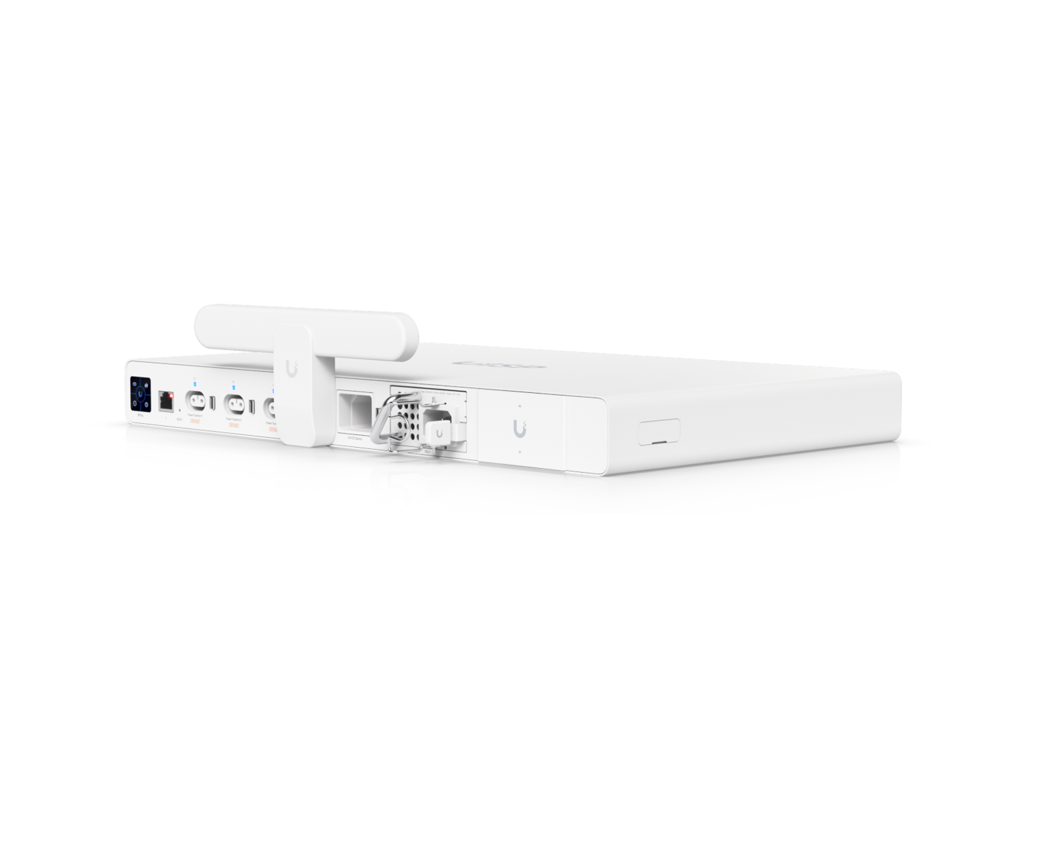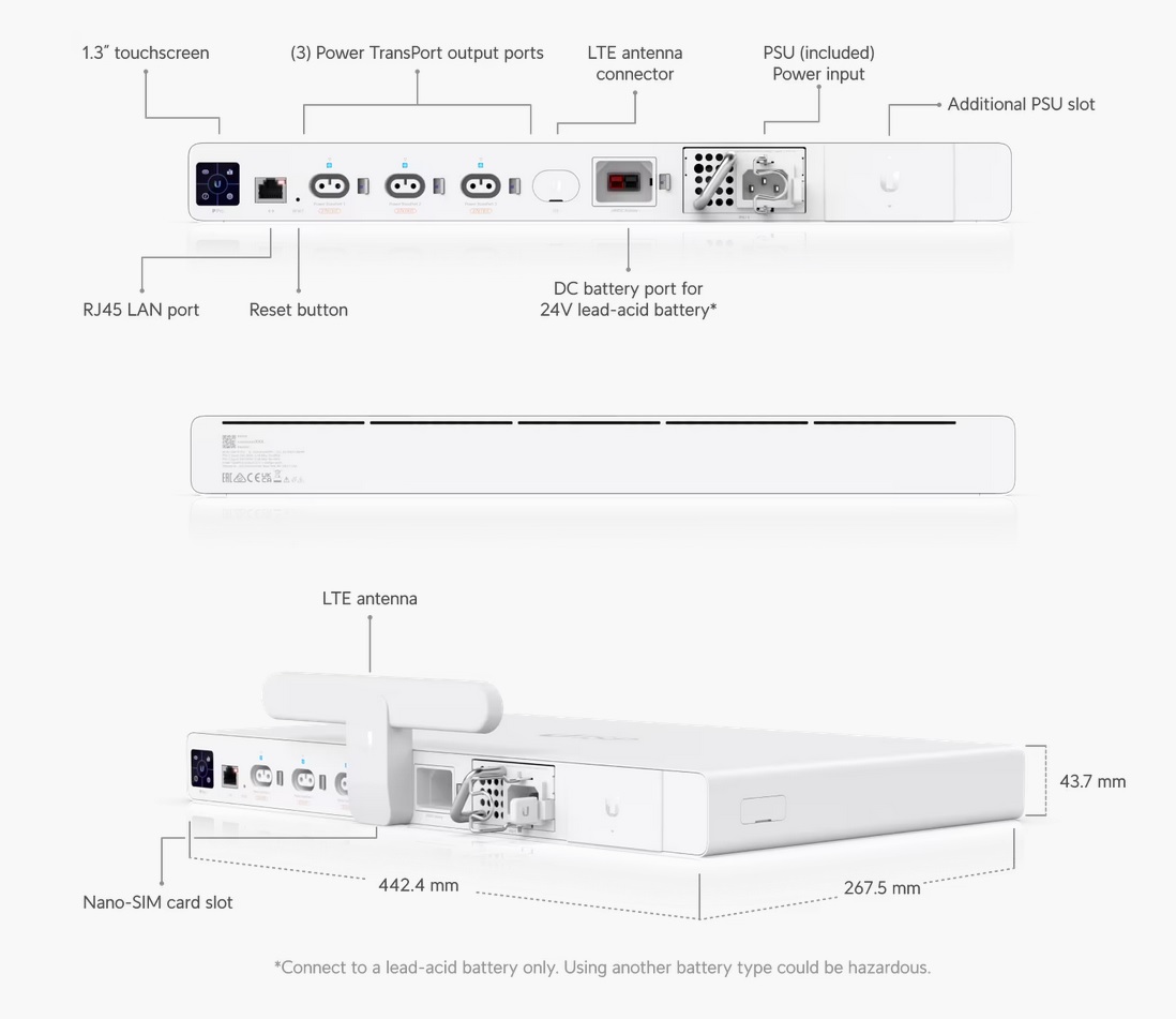 Zdroj je vybaven třemi výstupy typu TransPort, který je kompatibilní s vybranými zařízeními z produktové řady UISP. Kromě výstupů TransPort jsou na přední straně 2 šachty pro napájecí zdroje (1 osazena z výroby), konektor pro připojení olověné baterie a dále se zde nachází 1,3" dotykový displej, 1x R45 management port a konektor pro připojení LTE modulu.