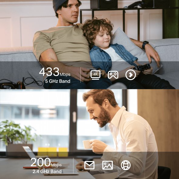 Pomocí USB klienta přijímáte signály WiFi na 2 samostatných pásmech. Rychlost sítě dosahuje až 600 Mb/s (200 Mb/s na 2,4 GHz pásmu a 433 Mb/s na 5 GHz pásmu). Frekvence 5 GHz se skvěle hodí pro streamování videa v HD kvalitě a hraní online her bez zpoždění. Frekvenci 2,4 GHz využijete pro běžné používání – surfování na internetu.