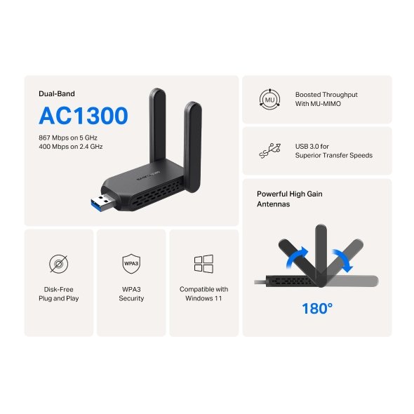 USB 3.0 klient, silné dvoupásmové Wi-Fi připojení - v pásmu 5 GHz rychlost až 867 Mb/s, v pásmu 2,4 GHz až 400 Mb/s, MU-MIMO, vylepšené zabezpečení WPA3, instalace Plug & Play, 2x výkonná anténa.