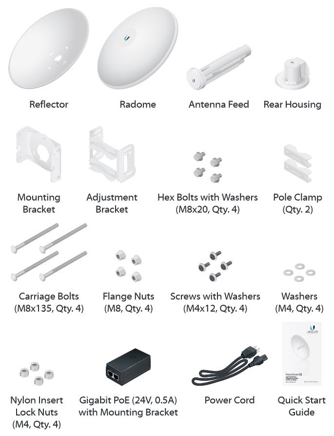 Obsah balení: zařízení, PoE zdroj, napájecí kabel, manuál, montážní kit k přichycení na stožár, parabola, plastový držák