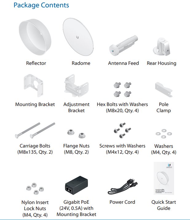 Uvnitř PowerBeamu se nachází výkonný MIPS procesor Atheros 74KC s frekvencí 560MHz, kterému sekunduje 64MB operační paměti typu DDR2 a 16MB Flash paměť. Síťový port podporuje 10/100/1000 Ethernet a lze po něm jednotku napájet pasivním Gigabit PoE 24V/0,5A adaptérem, které je součástí balení (aktivní PoE dle 802.3af není podporováno).