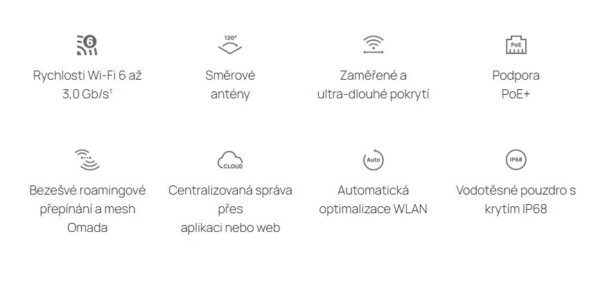 Venkovní přístupový bod s technologií Wi-Fi 6 AX3000. 1× GLAN, krytí IP68, rychlost 2402+574 Mb/s, PoE, centralizovaná správa přes systém Omada, směrové antény, provozní teplota -30 až 70 °C.