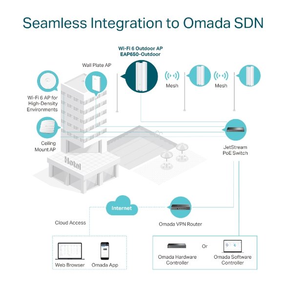 Omada (SDN) patří mezi platformy softwarově definovaných sítí. Sjednocuje síťová zařízení, přístupové body, switche a routery. Tato platforma vám pomůže s cloudovou správou. Vytvoříte sítě, které ovládáte a řídíte z jednoho rozhraní. S přístupovými body Omada EAP a technologií Omada Mesh rozšíříte svůj bezdrátový WiFi signál. Pokryjete i místa, kam není možno zavést kabel.