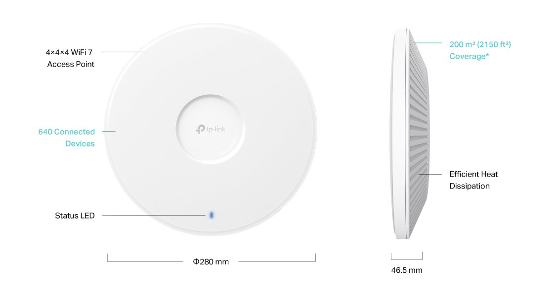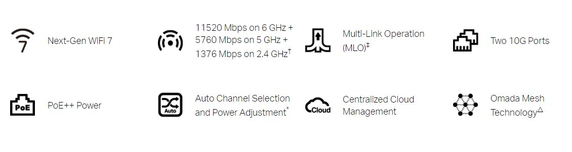 Router, třípásmové připojení – 11 520 Mbps v pásmu 6 GHz, 5 760 Mbps při 5 GHz a 1 376 Mbps při 2,4 GHz, standard WiFi 7, Multi-Link Operation, Multi-RUs, správa pomocí platformy Omada SDN, kvalitní zabezpečení WPA3.