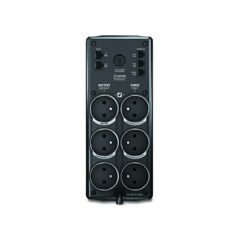 Záložní zdroj APC Power-Saving Back-UPS 900VA, 540W, technologie line-interactive, je vybavený: 1x vstupní zásuvka francouzská, výstupní zásuvka 6x francouzské (3 zálohované a 3 pouze přepěťové). Poskytuje ochranu analogové telefonní linky pro telefon, f
