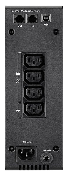 Záložní zdroj může napájet až 4 zařízení pomocí IEC zásuvek a 1 datové linky. Zařízení poskytuje nejen zálohu napájení zátěže z baterií, aby udržela zařízení v činnosti při výpadku napájení, ale poskytuje také účinnou ochranu proti přepětí a zabraňuje poškození připojených zařízení napěťovými špičkami.
