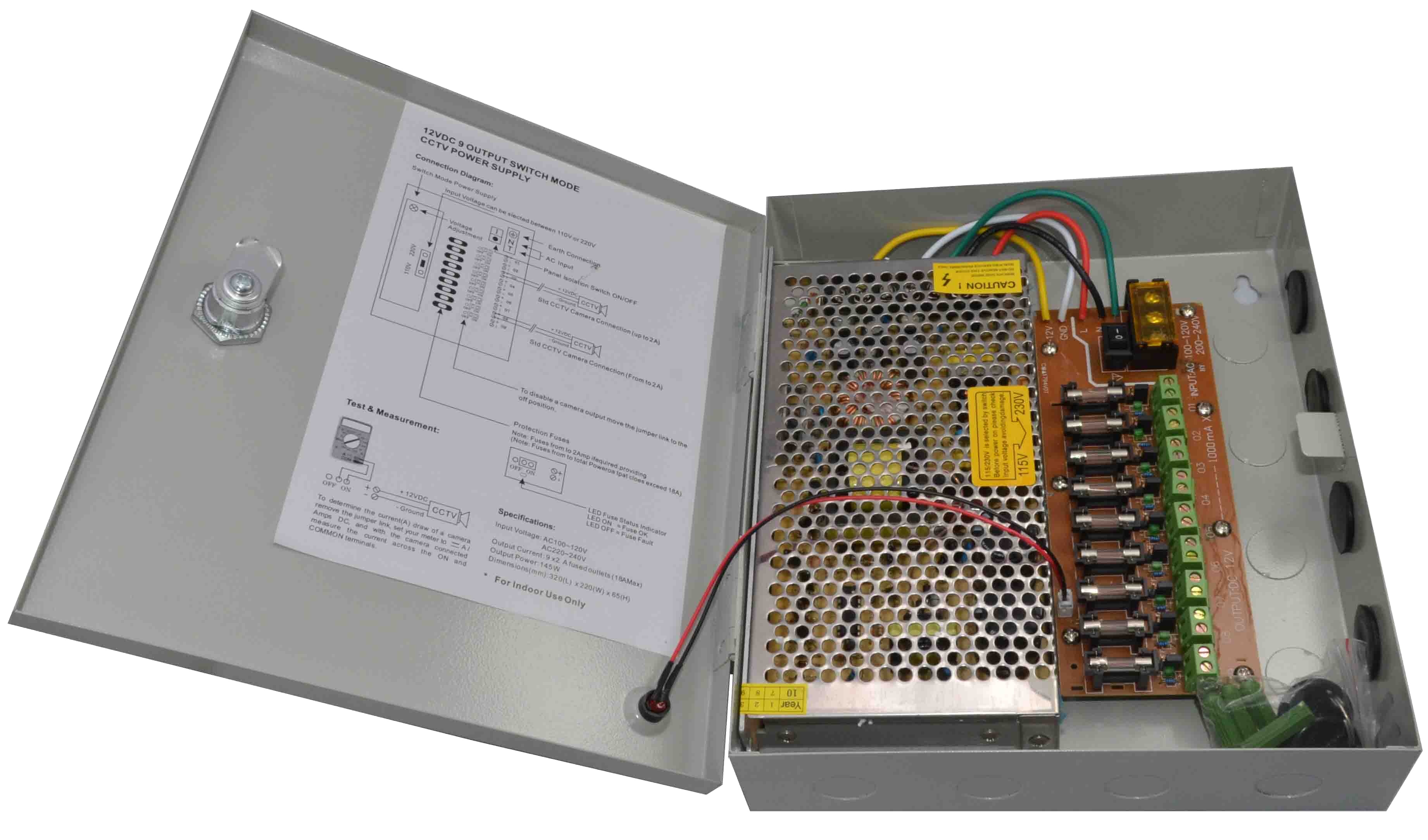 Napájecí zdroj 230V - 12V/20A  18 výstupů v krytu s průchodkami.  Maximální celkový výstupní proud 20A maximální proud pro 1 výstup 1,5A    šxvxh  235x280x90mm